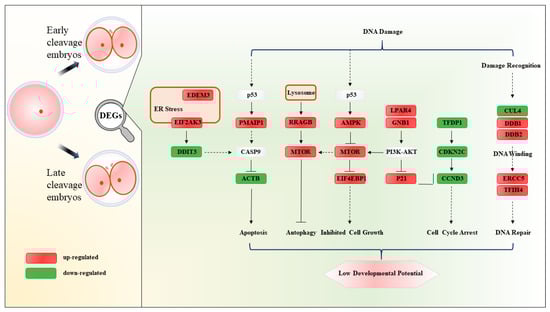 The molecular mechanism underlying the better developmental potential of early cleavage embryos is summarized in Figure 3. The genes related to NER, including DDB1, DDB2, ERCC5, and GTF2H4, were significantly upregulated in late cleavage embryos, suggesting more severe DNA damage in the LC embryos. DNA damage triggers a series of signaling cascades promoting cellular survival, including DNA repair, cell cycle arrest, autophagy, and apoptosis. The EDEM3, EIF2AK3, and PMAIP1, which are related to the endoplasmic reticulum (ER) and apoptosis, were found overexpressed in late cleavage embryos, suggesting that the DNA damage further caused the ER stress. While the expression of cell cycle-related genes, such as TFDP1, CDKN2, and CCCND3, was found lower in late cleavage embryos, suggesting that the development of embryos was arrested until the completion of DNA repair. DNA damage also may cause a large number of misfolded proteins in the embryo, activate the p53 signaling pathway, and cause cell apoptosis. Higher expression of genes concerning the proteasome, lysosome, oxidative phosphorylation, and the PPAR signaling pathways, such as PSMF1, CLN1, COX11, and PLIN2, were found in the LC embryos. Moreover, the expression of genes related to P53 and the MTOR signaling pathway, including RRAGB, mTOR, AMPK, EIF4EBP1, LPAR4, GNB1, and P21, were also found significantly higher in late cleavage embryos, which supports the above opinion. Therefore, we hypothesize that the endoplasmic reticulum stress and DNA damage led to embryonic retardation in the LC embryos.