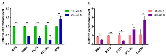 To verify the molecular mechanism underlying embryo development, the expression of genes related to apoptosis and pluripotency were analyzed using qRT-PCR. Results showed that the expression level of OCT4, SOX2, and KIF4 in EC embryos was significantly higher than that in the LC group (Figure 5A,B). The expression of BAX in the PA blastocysts developed from EC embryos was significantly lower (p < 0.05) than that from LC embryos. However, in the PA blastocysts, the expression of BCL-XL in EC embryos is significantly higher than in LC embryos, which is opposite to the IVF 2-cell embryos (Figure 5B). The expression level of CASP3 in the IVF EC embryos was found significantly lower than IVF LC embryos. These results support the analysis of RNA-seq.