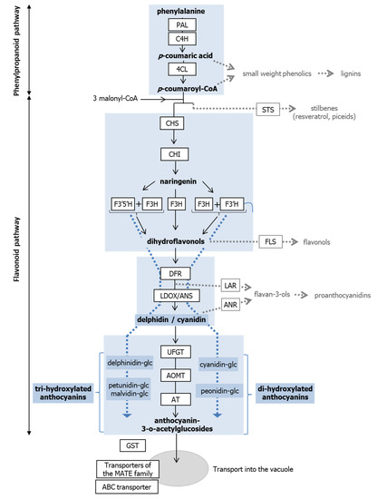 Anthocyanin biosynthesis pathway. Enzyme names are indicated in boxes. Enzyme names are as follows: PAL, phenylalanine ammonia lyase; C4H, cinnamate 4-hydroxylase; 4CL, 4-coumarate:CoA ligase; STS, stilbene synthese; CHS, chalcone synthase; CHI, chalcone isomerase; F3H, flavanone 3-hydroxylase; F3′H, flavonoid 3′-hydroxylase; F3′5′H, flavonoid 3′,5′-hydroxylase; FLS, flavonol synthase; DFR, dihydroflavonol 4-reductase; LAR, leucoanthocyanidin reductase; LDOX, leucoanthocyanidin dioxygenase; ANR, anthocyanidin reductase; UFGT, UDP glucose: flavonoid-3-O-glucosyltransferase; AOMT, anthocyanin O-methyltransferases; AT, anthocyanin 3-O-glucucoside-6″-O-acyltransferase; GST, glutathione S-transferase; MATE, multidrug and toxic extrusion, ABC transporters, transporters of the ATP binding cassette protein family. In parallel to the biosynthesis pathway, important anthocyanin intermediates are shown in blue boxes: delphidin, delphinidin-glc, petunidin-glc, and malvidin-glc correspond to tri-hydroxylated molecules whose synthesis involves F3′5′H and F3H. Cyanidin, cyanidin-glcm and peonidin-glc correspond to dihydroxylated molecules whose synthesis depends on F3′H and F3H.