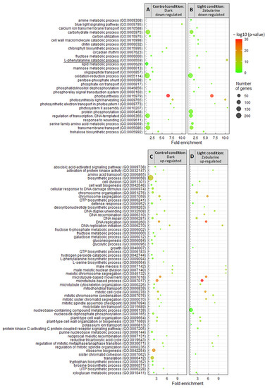Analysis of the GO biological processes enrichment revealed few similarities between the genes which were deregulated by zebularine in the dark and in the light. The GO analysis (biological processes) was conducted for the genes which were up-regulated in the DZ50 samples compared to the DD samples (A) and down-regulated in the DZ50 samples compared to the DD samples (B). The common biological process between light- and dark- deregulated genes (comparison between Figure 6 and Figure 7) is underlined.