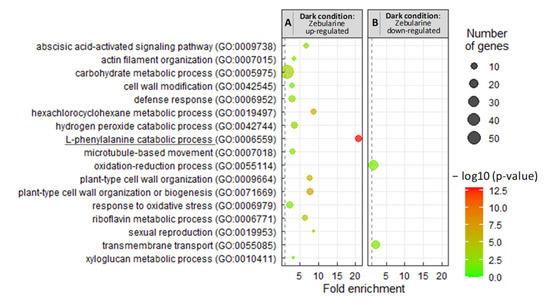 We also examined the GO enrichment of DEGs down-regulated by zebularine in the dark. Genes involved in carbohydrate metabolism, cell wall modification, cytoskeleton reorganization, as well as stress responses (hexachlorocyclohexane metabolic process, abscisic acid activated signaling pathway, hydrogen peroxide catabolic process, and response to oxidative stress) were the most represented (Figure 7). Furthermore, a MAPMAN analysis suggests a global repression of the central metabolism (Figure S5). Finally, only 2 GOs are detected as specifically enriched among the 245 up-regulated genes: transmembrane transport and oxidation–reduction process (Figure 7). No GO term was found in common between the genes which were deregulated by zebularine in the dark and in the light, except for the “L-phenylalanine catabolic process”. Interestingly, this GO term was associated with the genes down-regulated by zebularine (Figure 7), suggesting that the phenylpropanoid pathway may be specifically down-regulated at the gene expression level in zebularine treated cells. This result was unexpected regarding the increase in anthocyanin accumulation in these two conditions, prompting a more thorough analysis of the gene deregulations associated with the phenylpropanoid and flavonoid biosynthesis pathways.