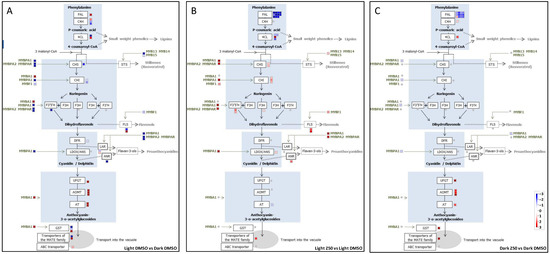 MAPMAN schematic representation of the anthocyanin biosynthesis pathway enlightening genes which were differentially expressed (|log2 FC| > 1, and padj > 0.05) (A) in the DMSO-treated light grown cells compared to the DMSO-treated dark grown cells, (B) in the zebularine-treated light grown cells compared to the DMSO-treated light grown cells, and (C) in the zebularine-treated dark grown cells compared to the DMSO-treated dark grown cells. (A) Red squares stand for genes up-regulated in light grown cells compared to dark grown cells and blue squares for genes down-regulated in light grown cells compared to dark grown cells. (B,C) Red squares stand for genes up-regulated in the presence of zebularine and blue squares for genes down-regulated by zebularine. The color intensity is proportional to the log2 FC as indicated in the upper left corners. The results obtained for the STS genes were not included since no specific behavior could be associated to this very large group of genes. Up-regulated genes in (A): PAL: Vitvi13g00622; C4H: Vitvi06g00803; 4CL: Vitvi06g01318; MYBA1: Vitvi02g01019; FLS: Vitvi18g02541; LAR: Vitvi17g00371; UFGT: Vitvi16g00156; AOMT: Vitvi01g01635, Vitvi01g02263, Vitvi01g02265; AT: Vitvi03g01816, Vitvi03g00077, GST: Vitvi04g00880; MATE transporter: Vitvi16g01913; ABC transporter: Vitvi16g01210; Down-regulated genes genes in (A): C4H: Vitvi11g01045; Vitvi11g00924; 4CL: Vitvi02g00938; MYB14: Vitvi07g00598; MYB15: Vitvi05g01733; MYBPA1: Vitvi15g00938; MYBPA2: Vitvi11g00099; MYBPAR: Vitvi11g00097; CHS: Vitvi14g01449; CHI: Vitvi13g01911; Vitvi04g00175; MYBF1: Vitvi07g00393; F3’5’H: Vitvi08g01637; FLS: Vitvi18g02538; DFR: Vitvi18g00988; LAR: Vitvi01g00234; ANR: Vitvi10g02185; GST: Vitvi19g01328; Vitvi19g01338; MATE transporter: Vitvi16g01911; Up-regulated genes in (B): 4CL: Vitvi02g00938; CHS: Vitvi14g01448, Vitvi14g01449; CHI: Vitvi13g01911, Vitvi14g01683, Vitvi04g00175; F3H: Vitvi04g01454; F3’5’H: Vitvi06g01885, Vitvi06g01192; LDOX/ANS: Vitvi02g00435; MYB14: Vitvi07g00598; MYBF1: Vitvi07g00393; FLS: Vitvi18g02538, Vitvi18g02541; ANR: Vitvi10g02185; MYBPA1: Vitvi15g00938; MYBPA2: Vitvi11g00099; MYBPAR: Vitvi11g00097; MATE transporter: Vitvi16g01911; Down-regulated genes in (B): PAL: Vitvi00g01367; Vitvi16g01507; Vitvi16g00061; Vitvi16g00055; Vitvi08g01022; Vitvi16g01502; Vitvi16g01503; Vitvi16g00057; Vitvi16g00066; Vitvi16g00054; Vitvi16g00060; 4CL: Vitvi11g01257; Vitvi18g00126; Vitvi06g01318; AT: Vitvi03g00077; Up-regulated genes in (C): PAL: Vitvi13g00622; C4H: Vitvi06g00803; 4CL: Vitvi02g00938; UFGT: Vitvi16g00156; AOMT: Vitvi01g01635, Vitvi01g02263, Vitvi01g02265; AT: Vitvi03g01816; GST:Vitvi04g00880; MATE transporter: Vitvi16g01913; Down-regulated genes in (C): PAL: Vitvi00g01367; Vitvi16g00066; Vitvi16g00054, Vitvi16g00060, Vitvi08g01022, Vitvi16g01507, Vitvi16g00061, Vitvi16g00055, Vitvi16g01502, Vitvi16g01503, Vitvi16g00057; AT: Vitvi03g00077; MYBPA1: Vitvi15g00938.