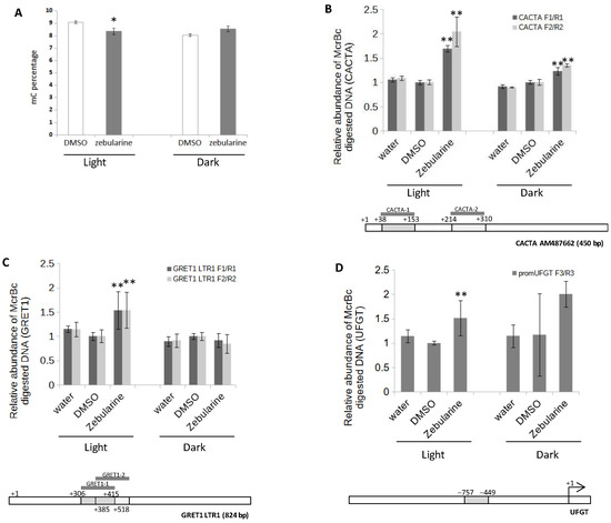 As methylation is mainly associated with repetitive sequences such as transposons (TEs), we analyzed the methylation status at selected TEs using McrBC-qPCR. The McrBC restriction enzyme only cuts methylated DNA. Therefore, the PCR efficiency is inversely correlated with the methylation level at a selected locus [42]. Two TEs were selected for this analysis: GRET1 a gypsy-type retrotransposon ([91], accession: AB111100) and a DNA-type transposon of the CACTA family ([92], accession: AM487662). As shown in Figure 9B,C, the qPCR amplifications of digested CACTA_AM487662 and GRET1 TEs were, respectively, 1.9- and 1.5-fold higher, using DNA from zebularine-treated cells than of control cells, indicating that both TEs are less methylated after zebularine treatment in light grown cells. In dark grown cells, a similar trend was observed for CACTA_AM487662, with a 1.3-fold higher amplification in zebularine-treated samples compared to the controls (Figure 9B). In contrast, in dark grown cells, GRET1 amplification was similar with and without zebularine treatment (Figure 9C). These results suggest that zebularine treatments were associated with a decrease in DNA methylation at specific loci, such as transposons, with a more important effect in the light than in the dark. Of note, other loci, such as MYBA2 promoter behaved differently, with no significant variation in McrBC-qPCR amplification in the different conditions analyzed (Figure S9).