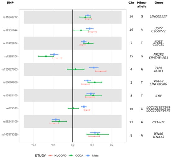 We performed GWAS with linear regression for the CODA and KUCOPD data. A multi-dimensional scaling plot based on our dataset and the 1000 genome datasets was generated; no evidence of population stratification was found for both the CODA and KUCOPD data (Supplementary Figure S1). However, both CODA and KUCOPD data were case-control data, and the population stratification was expected to be the main confounder for genetic analyses. Ten PC scores were utilized as covariates to adjust this problem. Quantile-quantile plots for GWAS with CODA data, KUCOPD data, and their meta-analyses are shown in Supplementary Figure S2. There was no genomic inflation, as indicated by the genomic inflation factors (ΛCODA = 1.00, ΛKUCOPD = 0.99, Λmeta = 1.00). In Supplementary Figure S3, the top Manhattan plot indicated a genetically significant locus (rs4491106, β = 0.1503, p = 1.58 × 10−8) in the linear regression of CODA data. However, there were no significant SNPs in the linear regression of KUCOPD data (bottom Manhattan plot). For meta-analysis, rs11648772, located on chromosome 16 in LINC02127 and Spalt-like transcription factor 1 (SALL1), met the genome-wide significance level (p = 1.41 × 10−8) (Figure 2). Table 2 shows the results for the most significant ten SNPs by meta-analysis. The MAFs of the ten SNPs were compared with those of the SNPs in the Korean reference (Kref) dataset. When there were several genome-wide significant SNPs in the same LD block, only the most significant SNP was included. Figure 3 shows the forest plot for the top ten SNPs in Table 2. In particular, rs11648772, which is located near rs147153117, has been shown to be associated with post-bronchodilator and FEV1/FVC ratio []. In summary, we found rs11648772 located near the SALL1 gene is genetically correlated with airway wall thickness in a meta-analysis using CODA and KUCOPD data.