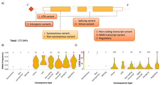 We annotated the full set of GVs with Variant Effect Predictor (VEP) [11] and Combined Annotation Dependent Depletion (CADD) [12]. VEP annotates GVs’ consequence type using the Sequence Ontology, its allele frequency from the 1000 Genomes Project Phase 3 along with the genomic coordinates, chromosome, and mapped gene at ±5000 bp distance (from now on pGenes). Combined Annotation Dependent Depletion (CADD) assesses GVs’ potential pathogenicity by evaluating the PHRED-like scaled C-score; the recommended cut-off ≥ 15 was set to identify potentially pathogenic variants.