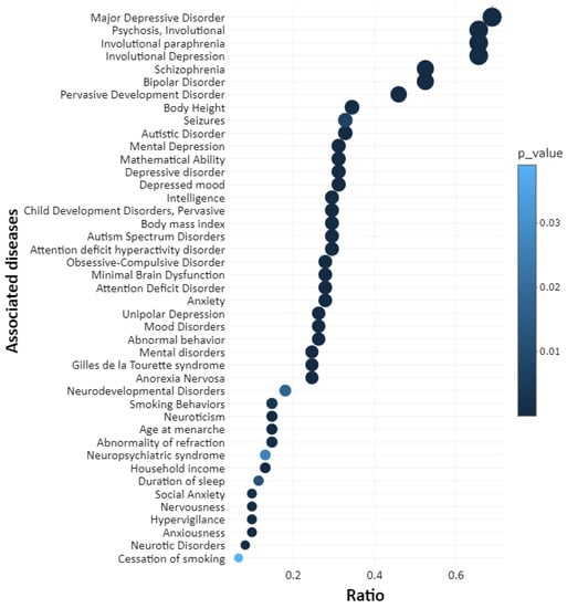 pGenes are associated with mental disorders. Result of the disease enrichment analysis. The ratio corresponds to the number of pGenes associated with each disease relative to all pGenes. Dot size is proportional to the number of pGenes associated with each disease. Gene enrichment analysis was performed using g:Profiler and the DISGENET plus database. pGenes: proximal genes.