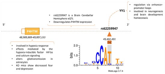 Regarding the association rs62259947: YY1 → P4HTM, P4HTM has been related to neurological disorders and social behavior (Figure 3) [51,52]. It is involved in Ca2+ signaling mediated by the hypoxia-inducible factor HIF1α altering astrocytes gliotransmission [51]. Indeed, hypoxia has been associated with mental disorders in general and MD in particular [77,78,79,80]. In addition, P4HTM null mutation results in a reduction in fear and depression [52]. In turn, rs62259947 downregulates the expression of P4HTM and changes the binding affinity of YY1 in the Brain Cerebellar Hemisphere. Additionally, YY1 regulates transcription by forming loops, although its specific role as activator or repressor is not yet fully understood [50]. Furthermore, P4HTM and HIF1α have been reported as potential drug targets for MD [52,81]. rs11227217 and RAD21 are associated with red blood cell and reticulocyte count, respectively, by PheWAS [15]. Indeed, red blood cell parameters have been described as altered in patients with mental disorders [82].