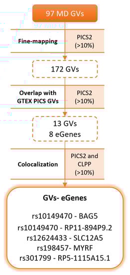Fine-mapping and colocalization analysis of MD GVs. MD GWAS GVs have been fine-mapped using PICS and overlapped with GTEx PICS GVs to ultimately perform a colocalization analysis identifying 4 colocalizing GVs affecting the expression of 5 eGenes. MD: major depression; GV: genetic variant; GWAS: genome-wide association studies; PICS: Probabilistic Identification of Causal SNPs; GTEx: Genotype-Tissue Expression; eGenes: genes regulated by expression quantitative trait loci; CLPP: colocalization posterior probability.