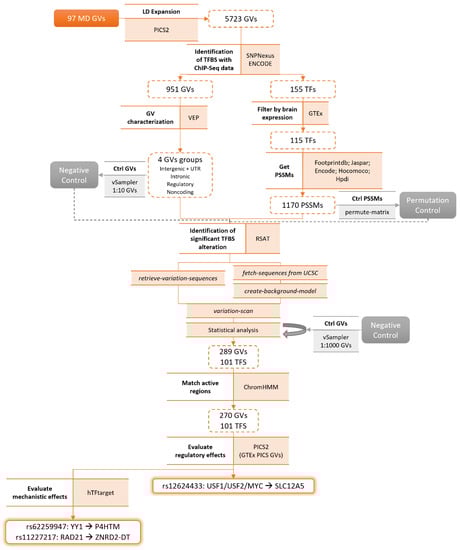 The initial set of 5723 GVs associated with MD was first mapped to transcription factor binding sites (TFBS) using Chip-Seq data from ENCODE. A total of 955 GVs were identified as potentially altering the TFBS of 155 TFs (Scheme 2). The GVs’ functional impact was assessed with VEP, and 4 sets were created: (a) intergenic and UTR GVs (333), (b) intronic GVs (562), (c) regulatory GVs (303), and (d) non-coding GVs (389). In addition, we further selected those transcription factors (TFs) that were expressed in brain tissues (≥2 TPM), which left 115 TFs.