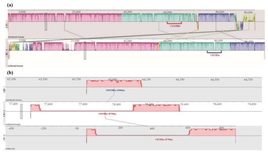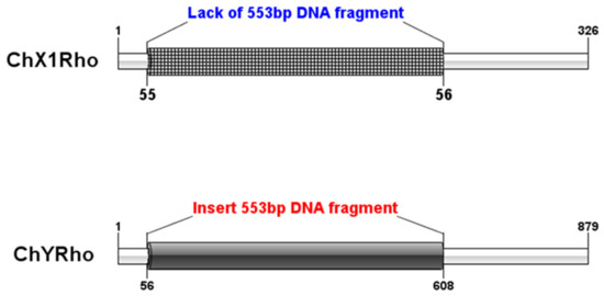 We can conclude that a DNA sequence insertion of size 553 bp was found between the 55th and 56th positions on ChY Rho by aligning with the homologous sequence of ChX1Rho. Figure 4 is a pattern diagram of the insertion of 553 bp DNA fragments between the nucleotide sequences of ChX1Rho of the X chromosome and ChYRho of the Y chromosome (Figure 4).