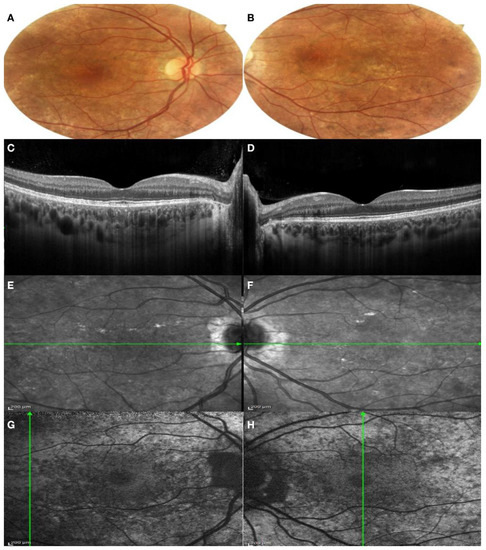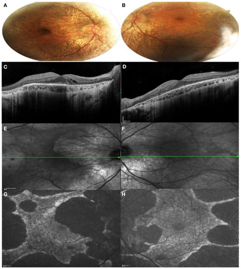 Multimodal imaging of both eyes of Patient II:2. (A,B) Color fundus photography of both eyes showed mild peripapillary atrophy, areas of hyper-pigmentation in the perifoveal area and pigmentary changes at the level of the vascular arcades; (C,D) SD-OCT of both eyes showed thinning of the ONL in the perimacular zone. IZ-EZ and the RPE–Bruch’s complex were irregular, with spot of hyper-transmission posterior to the RPE-Bruch’s membrane; (E,F) IR images showed normal aspect of the macular area and hypo-reflective areas among the vascular arcades; (G,H) normal autofluorescence of the macular area and a generalized hypo-fluorescence of the vascular arcade area. (A,C,E,G): right eye; (B,D,F,H): left eye.