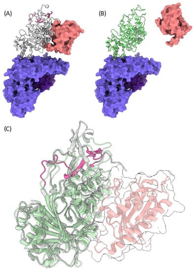 (A) The structure of wild type REP1 is shown in grey, with the peptide codified by exon 10 colored in magenta. The interacting RGGT is shown as a deep purple surface, while Rab7 is shown as a pink surface. (B) The image shows the interaction lost due to the lack of exon 10 in mutated REP1 (green illustration), while the interaction with RGGT is presumably conserved, given the invariant interaction interface. (C) A zoomed view of the interaction with Rab7 (pink illustrations and transparent surface) showing the different interaction interface affecting the binding of Rab7 due to the different conformation of REP1, lacking exon 10 (magenta).