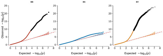 Quantile–quantile (Q–Q) from GWAS for beak color trait in duck. Q–Q plot showing the late separation between observed and expected values. The red lines indicate the null hypothesis of no true association. Deviation from the expected p-value distribution is evident only in the tail area for each trait, indicating that population stratification was properly controlled. BB refers to black beak; BS refers to spotted beak; BY refers to yellow beak.