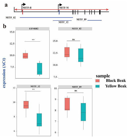 Expression differences in EDNRB2 and MITF on three exon junctions between black and yellow beaks according to RT-qPCR. (a) Information on the MITF isoform. The red triangle represents the intronic insertion on chromosome 13 in Pekin ducks. Exon 1M is specific for the MITF-M transcript, while exon 1B is specific for the MITF-B transcript. (b) EDNRB2 and MITF on three exon junctions between black and yellow beaks. Each exon junction was assayed in six biological replicates with three technical replicates. The indicated p-values were based on one-way ANOVA. NS, nonsignificant; **, extremely significant.