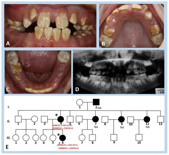 Clinical photographs, panoramic radiograph, and pedigree of the girl from family I. (A–C) Mixed dentition of the 9-year-and-10-month-old probed (III.6) reveal the chalky-white to yellowish hyperplastic enamel of all deciduous and permanent teeth. On the occlusal surfaces of upper and lower deciduous molars and permanent first molars, profound attrition is observed. Permanent first molars are covered with extensive glass ionomer fillings. All first deciduous molars and the lower right second deciduous molar were extracted. Both upper lateral permanent incisors are erupting ectopically. (D) Panoramic radiograph shows the presence of all permanent germs (wisdom teeth included). Those teeth that have developing tooth crowns not erupted exhibited normal anatomy, with enamel of normal thickness but lacking contrast between enamel and dentine. (E) Pedigree of family I shows the presence of an X-linked mode of inheritance. The arrow indicates the girl described (III.6); the symbol (*) indicates participating individuals; NA indicates not-available family members.