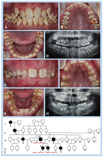 Clinical photographs, panoramic radiographs, and pedigree of the girls from family II. (A–C) Hypomineralised mixed dentition of the 11-year-and-6-month-old girl (IV.4) also exhibits some hypoplastic areas on all tooth crowns. Teeth are whitish with diffuse chalky-like patches, in some areas altering to yellow-brownish. All permanent incisors are restored with composite resins and all premolars and molars with glass ionomers. (E–G) The enamel of the 6-year-and-9-month-old sister (IV.5) is similarly altered, of chalky to yellowish colour. All deciduous and permanent molars are covered with extensive temporary fillings. (D,H) The panoramic radiographs show the enamel of adequate thickness, but with radiopacity, similar to dentine. (I) The filled symbols denote individuals of four generations of family II who have similarly affected enamel. Arrows indicate both girls examined (IV.4 and IV.5), the symbol (*) indicates family members who participated in the study, and NA indicates non-available family members.