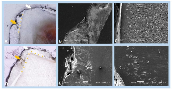 Images of (A–C) an exfoliated and etched lower deciduous first molar (tooth 74) of the girl (III.6) from family I and (D–F) a non-etched upper deciduous second molar (tooth 65) of the older girl (IV.4) from family II. (A,D) Light microscopy reveals a pitted enamel surface (yellow arrows) that is also missing in some areas due to attrition (white arrows). Two layers of enamel are visible, with the inner layer (asterisks) being better mineralised (etched, ×60 and non-etched, ×100, respectively). (B,E) Scanning electron microscopic (SEM) images of these same surfaces of both affected teeth show rather normal structures in the inner enamel layer and irregular histology with numerous voids and amorphous artefacts in the outer layer (etched, ×150, SEI and non-etched, ×120, SEI, respectively). (C,F) Under higher magnification, we see profoundly porous enamel and a reduced number of enamel prisms with increased inter-prism space in the outer layer (etched, ×800, SEI and non-etched, ×850, SEI).