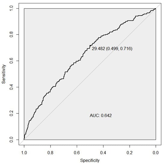 We compared the discriminative ability of two PGS models for the case/control status by developing the ROC curves. The microRNA biogenesis pathway weighted PGS predicted the risk of developing ccRCC with an AUC of 0.642 (95% CI [0.61–0.67], sensitivity of 0.71, and a specificity of 0.50 (Figure 1). For the unweighted PGS model, see Figure S1 in Supplementary File_1.docx.