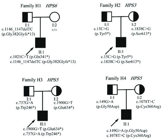 Eight causative mutations were detected in the four HPS probands. Results revealed that H1 patient carried compound heterozygous variants in HPS6 NM_024747, c.1021C>T (p.Gln341*) and c.1146_1147delTC (p.Gly382Glyfs*13). The H2 patient harbored a homozygous variant in HPS3 NM_032383.5, c.15C>G (p.Tyr5*) and c.1838C>G (p.Ser613*). H3 and H4 patients carried compound heterozygous variants in HPS5 NM_181507.2, c.1900G>T (p.Glu634*) and c.737G>A (p.Trp246*), and HPS5 NM_181507.2, c.149G>A (p.Gly50Asp) and c.1078T>C (p.Cys360Arg), respectively. Pedigree analysis of the four families is shown in Figure 2.