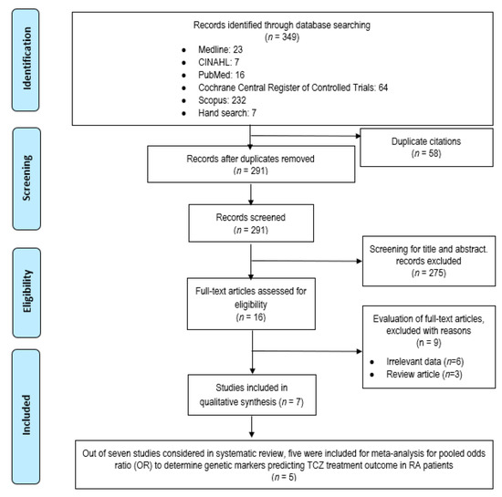 Two individual searches of international literature reviews and studies were carried out using PubMed, Medline Complete, CINAHL Plus, Cochrane Central Register of Controlled Trials and SCOPUS, for clinical trials reporting on treatment response of TCZ from inception until January 2022. A systematic search was done using the MESH terms consisting of several domains: rheumatoid arthritis AND tocilizumab AND genetic AND treatment response. Additionally, we restricted the search to English language papers with full texts. A manual search was done based on cited references from retrieved articles. The details of the search terms have been presented in Supplementary Material Table S1.