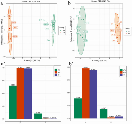 Metabolomics profiling. Orthogonal partial least squares-discriminant analysis (OPLS-DA) of NA vs. HA (a) and NA vs. PA (b). The 200-response sorting tests of the OPLS-DA model for NA vs. HA (a′) and NA vs. PA (b′). Q2 is an important parameter for evaluating the OPLS-DA model. R2X and R2Y represent the percentage of the OPLS-DA model that can explain the X and Y matrix information, respectively.