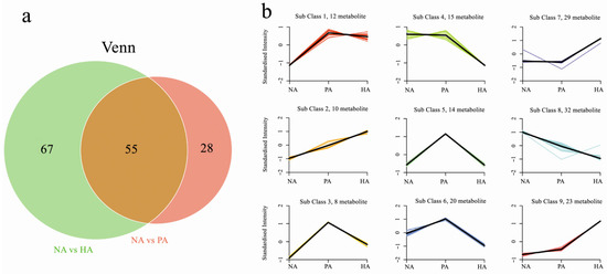 Venn diagram (a) and K-means (b) analyses of differentially abundant metabolites.