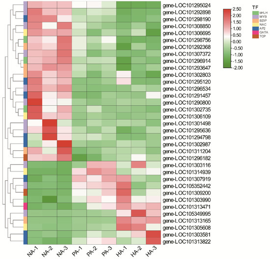 The significant DEGs included 35 genes encoding TFs that were predicted to be associated with aroma formation. Of these DEGs, 12 and 23 had up-regulated and down-regulated expression levels, respectively (Table S5). Additionally, these genes encoded the following: four bHLH TFs, 11 MYB TFs, five bZIP TFs, four NAC TFs, eight AP2 TFs, one GATA TF, and two TCP TFs (Figure 8). Among the TF genes, TCP9 (LOC101309200) expression was up-regulated 36.85- and 31.62-fold, MYB (LOC105349995) expression was up-regulated 34.02- and 3.95-fold, AP2 (LOC101302987) expression was down-regulated 4.89- and 19.15-fold and bZIP (LOC101311204) expression was down-regulated 3.78- and 7.72-fold in the NA vs. HA and NA vs. PA comparisons, respectively (Figure 8), implying they may play a critical role in the formation of the peach-like aroma of F. nilgerrensis fruits.