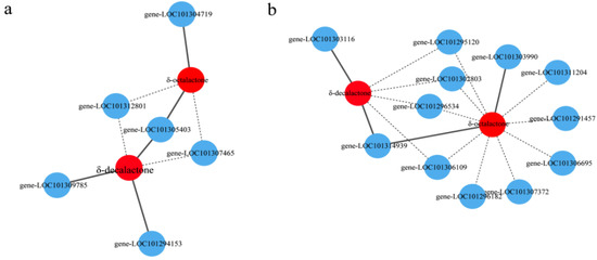 Analyses of the correlation between key structural genes and two key lactones (a) and between TFs and two key lactones (b). Blue circles represent the differentially expressed genes and TFs, whereas red circles represent the two key lactones. The solid and dotted lines indicate positive and negative correlations, respectively.