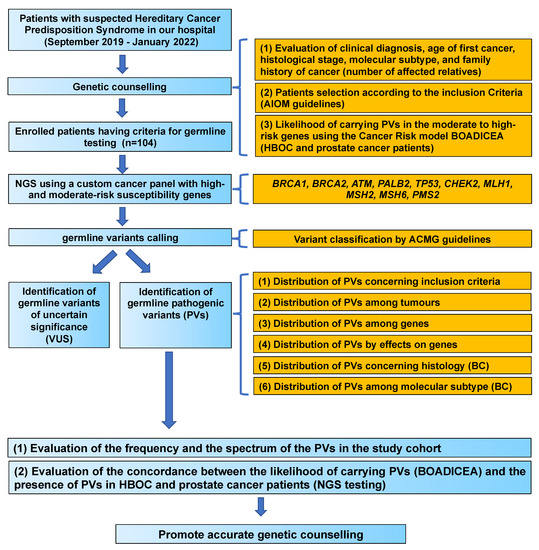 A total of 104 patients were selected after genetic counselling at the Medical Genetics Unit (Mater Domini University Hospital at Catanzaro) between September 2019 and January 2022 for the NGS genetic test according to the family and personal criteria established by the National Comprehensive Cancer Network (NCCN) and the Associazione Italiana di oncologia Medica [7,8]. Genetic counselling was performed to evaluate the patient’s cancer history (clinical diagnosis, age of first cancer, histological stage) and family history of cancer (number of affected relatives).