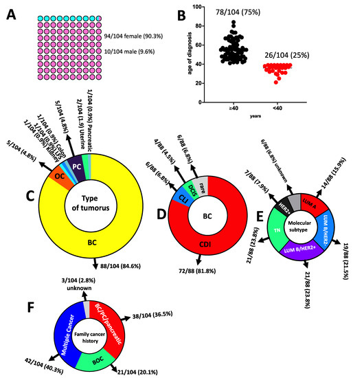 The study cohort included a total of 104 patients (94 females and 10 males; mean age of diagnosis 50.2, range 21–84 years, Figure 3A) with a clinical suspicion of hereditary cancer predisposition syndromes (HCPS) based on individual and family cancer history. A total of 26/104 (25%) patients were diagnosed with cancers before the age of 40 years, whereas 78/104 (75%) were diagnosed after 40 years of age (Figure 3B). At the first diagnosis, eighty-eight had breast cancer (BC), five had ovarian cancer (OC), five had prostate cancer (PC), one had colon cancer, one had pancreatic cancer, one had LFS, one had kidney cancer and two had uterine cancer (Figure 3C). Considering the 88 BC patients, 86 were monolateral and 2 were bilateral. Relating to BC histology, 72/88 (81.8%) had invasive ductal carcinoma (CDI), 4/88 (4.5%) had ductal carcinoma in situ (DCIS), 6/88 (6.8%) had invasive lobular carcinoma (CLI) and 6/88 (6.8%) had a rare BC histotype (Figure 3D). Among the 88 BC, the distribution molecular subtypes involved 14 (15.9%) Luminal A, 19 (21.5%) Luminal B-HER2-, 21 (23.8%) Luminal B-HER2+, 7 (7.9%) HER2+ and 21 (23.8%) TN (triple-negative) BC and 6 unknown molecular subtypes (6.8%) (Figure 3E). Among patients, 38/104 (36.5%) had a family history of BC, PC or pancreatic cancer, 21/104 (20.1%) had a history of BC and OC (HBOC), 3/104 (2.8%) had unknown family history whereas 42/104 (40.3%) were patients with a family history of multiple cancers (Figure 3F).