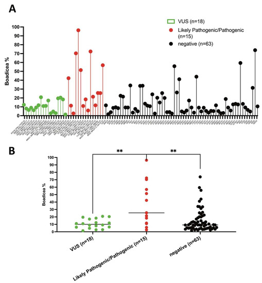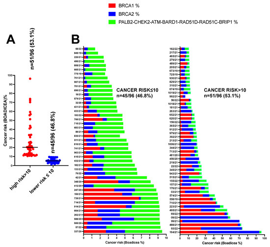 Therefore, the BOADICEA prediction model was used to calculate the likelihood of carrying pathogenic variants in the moderate-to-high-risk genes in eighty-eight BC, five OC and three PC patients (n = 96) using a 10% pretest probability threshold. A total of 51/96 (53.1%) patients having BOADICEA >10% probability were classified as high risk, whereas 45/96 (46.8%) patients with a percentage ≤10% were considered as low risk to be carriers of pathogenic variants in BRCA1, BRCA2, PALB2, CHEK2, ATM, BARD1, RAD51D, RAD51C and BRIP1 genes (Figure 4A). For each patient, we also showed the risk in the well-known high-penetrance cancer risk alleles BRCA1 and BRCA2 with respect to other moderate-penetrance alleles including PALB2, CHEK2, ATM, BARD1, RAD51D, RAD51C and BRIP1 (Figure 4B).