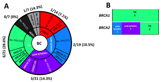 Interestingly, 6 PVs out of 13 (46.1%) observed in the BC patients were detected in triple-negative BC. In particular, 6 of 21 (28.6%) triple-negative BC patients, 3 of 21 (14.3%) Luminal B/HER2+ BC patients, 2 of 19 (10.5%) Luminal B/HER2- BC patients, 1 of 14 (7.1%) Luminal A BC patients and 1 of 7 (14.3%) patients with unknown molecular subtype were carriers of PVs (Figure 6A).