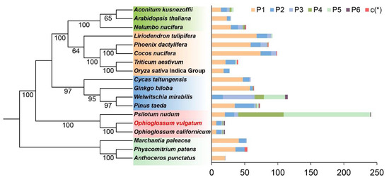 Simple sequence repeats (SSRs) characteristic of 18 representative species and their association with phylogeny. P1, p2, p3, p4, p5, p6, and c (*) represent mono-, di-, tri-, tetra-, penta-, hexa-, and compound SSRs, respectively. Clades in the tree are highlighted with color boxes. Horizontal axis in the right figure presents the number of different SSR types.