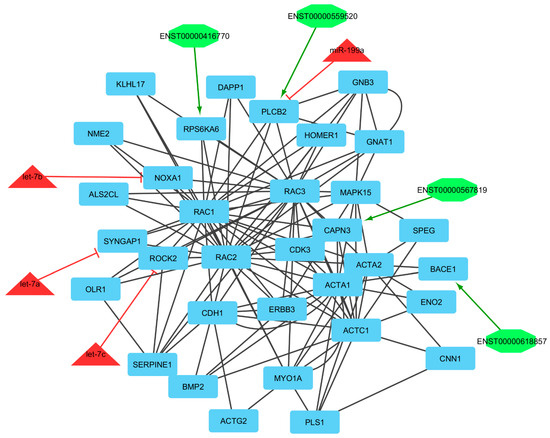lncRNA–miRNA–mRNA ceRNA network was constructed based on miRNA–mRNA and lncRNA–mRNA interactions and online interaction databases. The Pathway Resource List (http://pathguide.org (accessed on 15 March 2022)) is a meta-database that provides more than 300 web-accessible network databases and biological pathways [59]. PPI (protein–protein interaction) data were abstracted from the Database of Interacting Proteins [60], BIND (Biomolecular Interaction Network Database) [60], MIPS (Mammalian Protein-Protein Interactions Database) [61], and BioGRID (Biological General Repository for Interaction Datasets) [62]. In addition, interaction data were obtained from the analysis of related experiments and search in interaction databases such as Gene-MANIA [63] (https://genemania.org/ (accessed on 15 March 2022)) and the STRING database [64] (Search Tool for the Retrieval of Interacting Genes or Proteins; https://string-db.org (accessed on 15 March 2022)). To describe the interaction between proteins using a probabilistic confidence score, the string uses eight major sources of interaction or association data, including co-occurrence, neighborhood, fusion, co-expression, experimental, text mining, and database [64].
