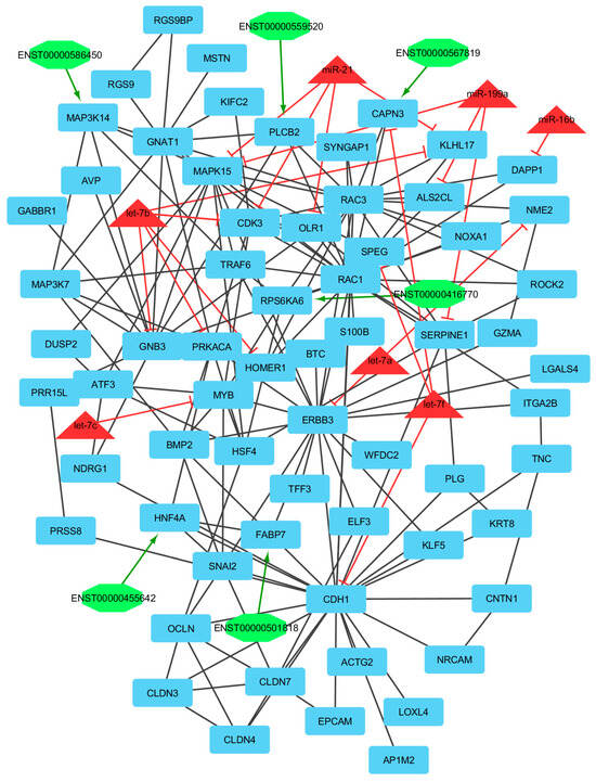 Module 5: 68 mRNAs/genes, 3 lncRNAs, and 6 miRNAs in an interacted network were identified. In this network, the quadrilateral nodes represent mRNAs/genes, octagonal nodes represent lncRNAs, and triangle nodes represent miRNAs. Edges indicate the interactions; black edges represent mRNA–mRNA interactions, green edges represent lncRNA–mRNA interactions, and red edges represent miRNA–mRNA interactions.