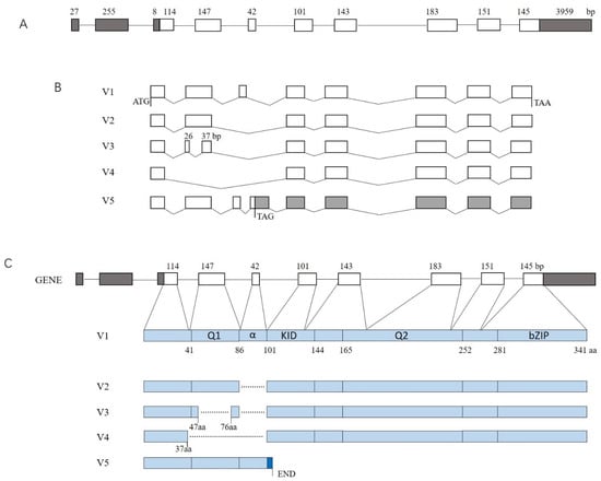 Schematic structure of the identified transcript variants of the porcine CREB gene. (A) Schematic diagram of the CREB gene (NM_001361427) structure. (B) Schematic structure of the alternative splicing transcripts. (C) Domain composition of the alternative splicing isoforms. Exons and introns are indicated with a box and a straight line, respectively. Oblique lines indicate that the sequences are spliced out. A blank box indicates a coding sequence, while a closed box indicates an untranslated region.