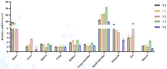 Real-time PCR analysis showed that isoforms V1–3 were ubiquitously expressed in all the tissues studied. V4 was not detected in the heart, liver, stomach, and fat tissues. V5 was not found in the heart and fat tissues (Figure 2).