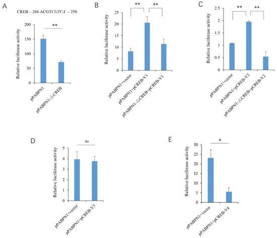 Effects of the transcript variants of CREB on the porcine PABPN1 promoter. (A) Effects of CREB motif deletion on promoter activity. The putative binding site is shown above, and the sequence deleted in the mutant-type reporter gene is indicated in italics. (B) Effects of V1 overexpression on promoter activity. (C) Effects of V2 overexpression on promoter activity. (D) Effects of V3 overexpression on promoter activity. (E) Effects of V4 overexpression on promoter activity. A Student’s t-test was used to compare the differences between the two groups. * and ** indicate that the differences were significant, at p < 0.05 and p < 0.01 levels, respectively, while ns, not significant, indicates that the differences were not significant (p > 0.05).