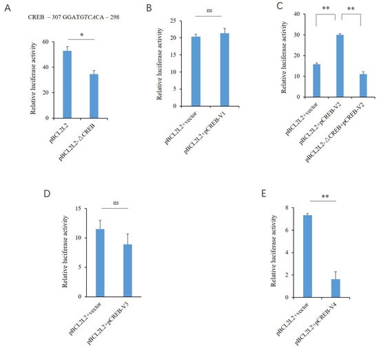Effects of the transcript variants of CREB on the porcine BCL2L2 promoter. (A) Effects of CREB motif deletion on promoter activity. The putative binding site is shown above, and the sequence deleted in the mutant-type reporter gene is indicated in italics. (B) Effects of V1 overexpression on promoter activity. (C) Effects of V2 overexpression on promoter activity. (D) Effects of V3 overexpression on promoter activity. (E) Effects of V4 overexpression on promoter activity. A Student’s t-test was used to compare the differences between the two groups. * and ** indicate that the differences were significant, at p < 0.05 and p < 0.01 levels, respectively, while ns, not significant, indicates that the differences were not significant (p > 0.05).