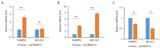 Effects of variants V1 (A), V2 (B), and V3 (C) of CREB on the expression of endogenous PABPN1 and BCL2L2 genes. A Student’s t-test was used to compare the differences between the two groups. * and ** indicate that the differences were significant, at p < 0.05 and p < 0.01 levels, respectively, while ns, not significant, indicates that the differences were not significant (p > 0.05).