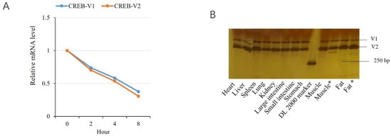 To characterize the AS events in CDS, a pair of primers were designed according to the porcine CREB (pCREB) mRNA deposited in GenBank (NM_001361427). PCR was carried out in a final volume of 25 μL containing 1 U exTaq DNA polymerase (Takara, Dalian, China), 1× PCR buffer, 0.2 μM of each primer, 200 μM of each dNTP (Takara, Dalian, China), and 1 μL of cDNA obtained from muscle tissues. The thermal cycling parameters were as follows: 94 °C for 5 min, followed by 30 cycles at 94 °C for 30 s, 59 °C for 30 s, 72 °C for 1 min, and a final extension at 72 °C for 7 min. All primers used in this study are listed in Table S3.