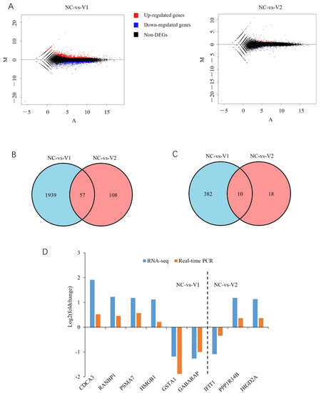 Overview of the RNA-seq data. (A) MA plot of the RNA-seq data. (B) Venn diagram of DEGs in cells overexpressing V1 and V2. (C) Venn diagram of differentially expressed transcription factors in cells overexpressing V1 and V2. (D) Validation of the RNA-seq data with real-time quantitative PCR.