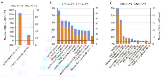 Gene Ontology (GO) and Kyoto Encyclopedia of Genes and Genomes (KEGG) analyses were performed on the NC-vs.-V1 and NC-vs.-V2 groups, and the results were compared to reveal the reason for their differential roles in the regulation of gene expression. Two GO terms were enriched in the cellular component category in each group, and there was no difference between the two groups (Figure 8A). Among the top 10 GO terms enriched in the biological pathway category, nine were common to the two groups. The terms developmental process and biological process involved in the interspecies interaction between organisms were specific to NC-vs.-V1 and NC-vs.-V2, respectively. In the molecular function category, a greater number of items differed between the two groups (Figure 8B). A total of six GO terms were differentially enriched in the two groups, of which the molecular transducer activity, structural molecule activity, antioxidant activity, and cargo receptor activity were specific to NC-vs.-V1, while the molecular function regulator and translation regulator activity were specific to NC-vs.-V2 (Figure 8C).