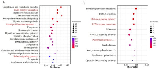 KEGG pathways significantly enriched by DEGs, regulated by V1 (A) and V2 (B). Pathways shared by the two groups are indicated in red. 1. Parathyroid hormone synthesis, secretion, and action. 2. Growth hormone synthesis, secretion, and action. 3. Vasopressin-regulated water reabsorption.