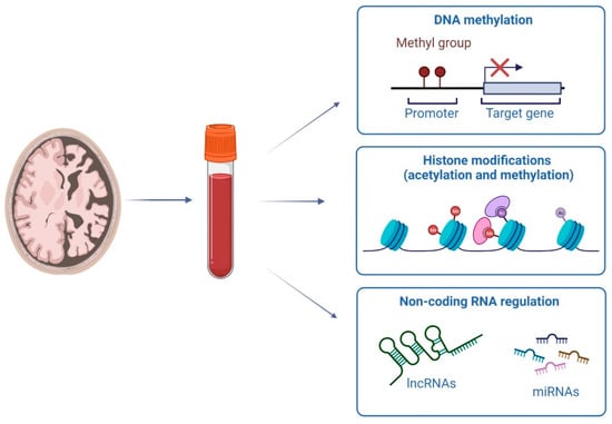 Despite AD prevalence and decades of intensive research into the disease pathogenesis, drugs that can prevent or even halt the progression of this disorder are still lacking in clinical practice [13]. Indeed, the majority of the current therapeutic strategies are merely symptomatic and often present several side effects [14]. Nowadays, the diagnosis of AD is based on clinical examination supported by the detection of Aβ, phosphorylated (p-tau), and total tau (t-tau) protein levels in the cerebrospinal fluid (CSF) of patients in combination with advanced neuroimaging techniques such as positron emission tomography (PET) and volumetric magnetic resonance imaging (MRI) [15]. However, these analyses are high invasive for the patients, poorly available in community health facilities, and relatively expensive for the healthcare system [16]. Moreover, as pathological modifications silently accumulate in the brain over years before the onset of evident symptoms, clinicians face difficulties in diagnosing AD prior to the occurrence of irreversible brain damage [17]. Thus, the current challenge is to search for less costly and intrusive biomarkers associated with pathophysiologic mechanisms and can be used at primary care settings in order to improve the accuracy of clinical AD diagnosis at early presymptomatic stages [18]. In this regard, epigenetics has recently emerged as a promising field for finding novel AD biomarkers, as epigenetic mechanisms have been demonstrated to be dysregulated in several human disorders, including AD [19,20]. By mediating the interplay between the genome and the environment, epigenetic mechanisms could explain the role of non-genetic factors in AD, thus leading to greater understanding of the disease etiology with potential implications also for the disease treatment. Interestingly, epigenetic alterations are also detectable in the peripheral blood of patients, providing easy-to-access biomarkers for the disease [21,22,23].