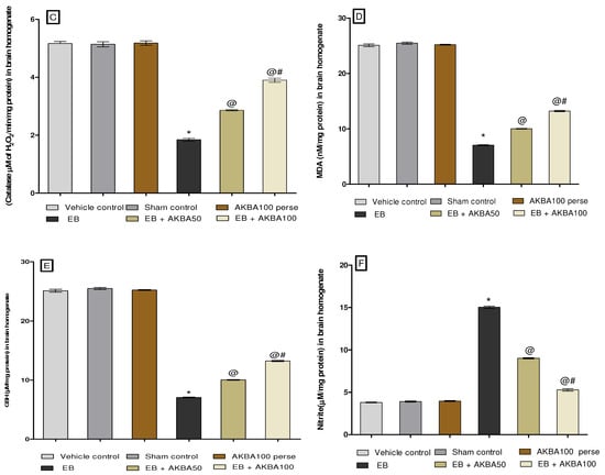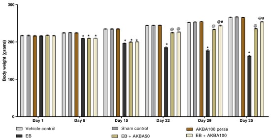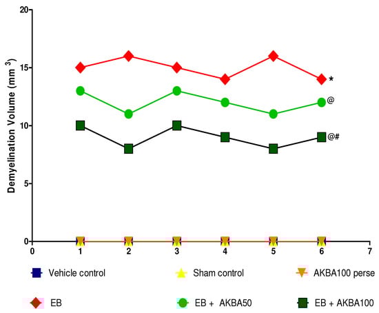 The body weight was measured on the 1, 8, 15, 22, 29, and 35 days. On the first day of the protocol schedule, all treatment groups had no significant change in body weight. After seven days of EB administration, the bodyweight of the rats gradually decreased in contrast to the vehicle-, sham-, and AKBA100 perse-treated rats. In comparison to the EB-injected MS rats, long-term oral administration with AKBA 50 mg/kg and 100 mg/kg resulted in a significant increase in body weight on the 22, 29, and 35days (two-way ANOVA: F(25,150) = 226.77, p < 0.001). AKBA 100 mg/kg-treated rats were more effective in restoring body weight than AKBA 50 mg/kg-treated rats on days 29 and 35 (Figure 2).