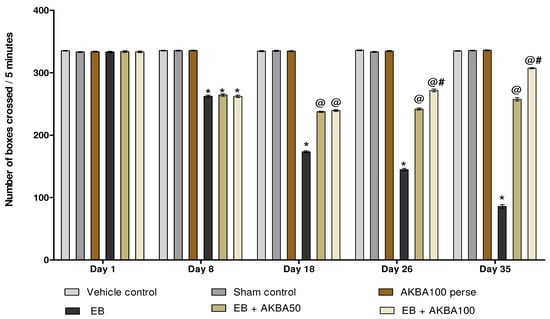 On days 1, 8, 18, 26, and 35, the effect of AKBA on locomotor activity was assessed. During the first day, all experimental groups had no significant change in locomotion. The rats treated with ED showed a significant decrease in locomotor activity on the eighth day, which continued throughout EB injection. Persistent treatment of AKBA 50 and 100 mg/kg orally improved locomotion on 18, 26, and 35 days as compared to the EB-induced MS-rats (two-way ANOVA: F(20,120) = 914.57, p < 0.001). On 26 and 35 days, AKBA 100 mg/kg was more potent and significantly improved locomotor activity more than the AKBA 50 mg/kg treatment group (Figure 6).