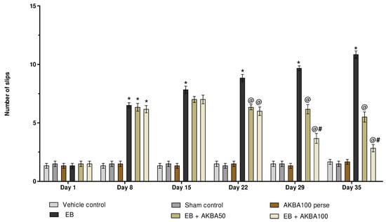 AKBA-mediated neuroprotective function on the number of slips in an experimental model of multiple sclerosis. Statistical values are represented as mean ± SEM (n = 6 for each group). Statistical significant analysis was performed by posthoc Bonferroni’s test with two-way ANOVA. Here, * indicates versus vehicle control, sham control and AKBA100 perse group (p < 0.001); @ indicates versus EB group (p < 0.001); @# indicates versus EB + AKBA50 group (p < 0.001).