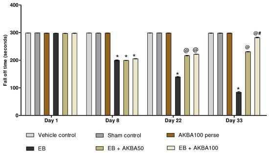 AKBA-mediated neuroprotective function on fall-off time in an experimental model of multiple sclerosis. Statistical values are represented as mean ± SEM (n = 6 for each group). Statistical significant analysis was performed by posthoc Bonferroni’s test with two-way ANOVA. Here, * indicates versus vehicle control, sham control and AKBA100 perse group (p < 0.001); @ indicates versus EB group (p < 0.001); @# indicates versus EB + AKBA50 group (p < 0.001).