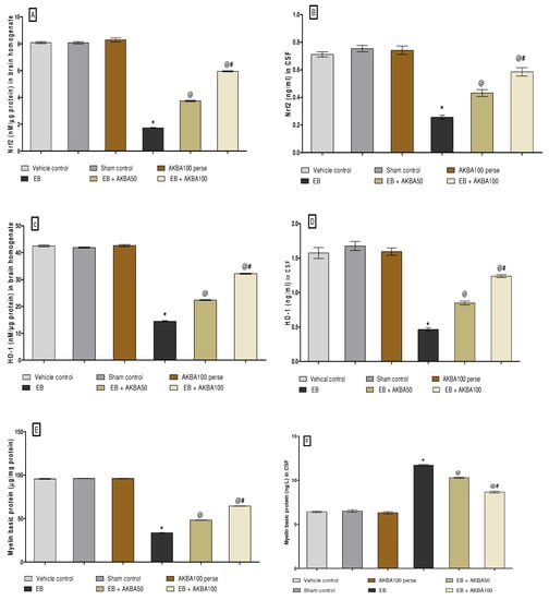 To determine whether AKBA is involved in the neuroprotective effect of the Nrf2/HO-1 transcription factor in EB-treated MS rats, the levels of Nrf2 and HO-1 were estimated in rat brain homogenate and CSF using an ELISA kit. EB-treated MS rats showed substantially decreased Nrf2 and HO-1 levels in the CSF and homogenate of the rat brain compared to the vehicle, sham, and AKBA 100 mg/kg perse treatment group. Prolonged oral treatment with AKBA 50 and 100 mg/kg substantially increased the level of Nrf2 in CSF sample (one-way ANOVA: F(5,25) = 0.365, p < 0.001) and homogenate of rat brains (one-way ANOVA: F(5,25) = 1.357, p < 0.001). Chronic oral administration with AKBA 50 and 100 mg/kg significantly increased the HO-1 level in rat brain homogenate (one-way ANOVA: F(5,25) = 2.376, p < 0.001) and CSF (one-way ANOVA: F(5,25) = 0.296, p < 0.001) as compared to the EB-induced MS rats. In contrast with the AKBA 50 mg/kg treatment group, the AKBA 100 mg/kg was more effective in restoring the Nrf2 and HO-1 protein levels than EB-induced MS rats (Figure 9A–D).